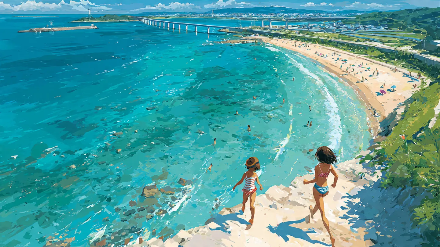 來這裡最讓人期待的,是退潮時才會現身的「希望之路(ピュアロード)」。一條從海灘延伸向對岸小島的沙洲,就這樣靜靜浮出水面,踩在上面的感覺像是海替你開了一條路,走著走著就到了海中央。沙洲出現的時間跟著潮汐走,出發前記得查好當天的退潮時刻,才不會撲空。